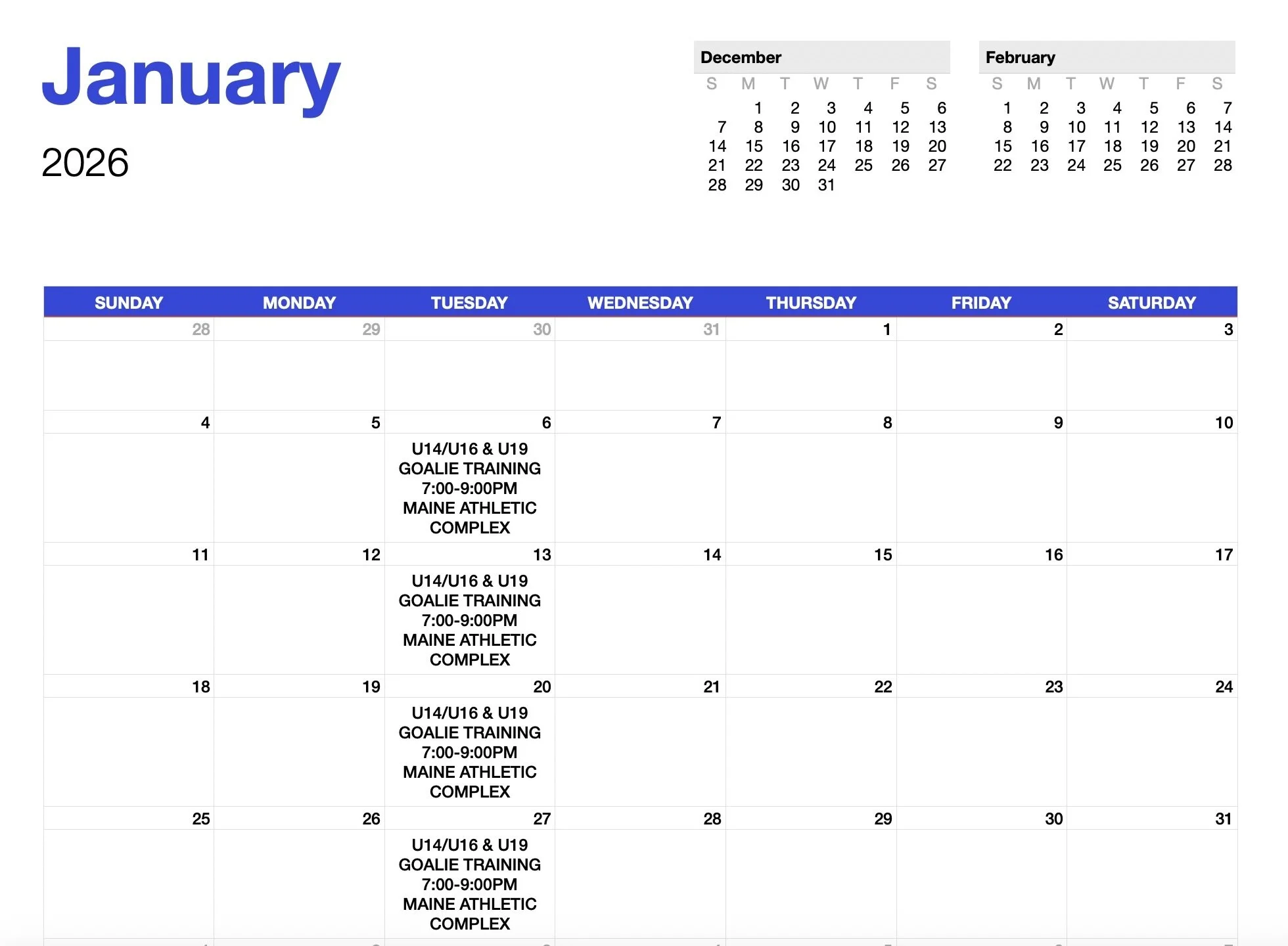U16 GK optional team training : Sundays 5:30-7:00pm - XL Sports (400 North St, Saco)