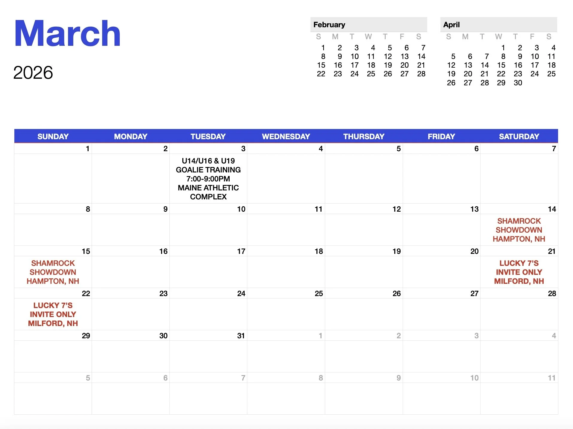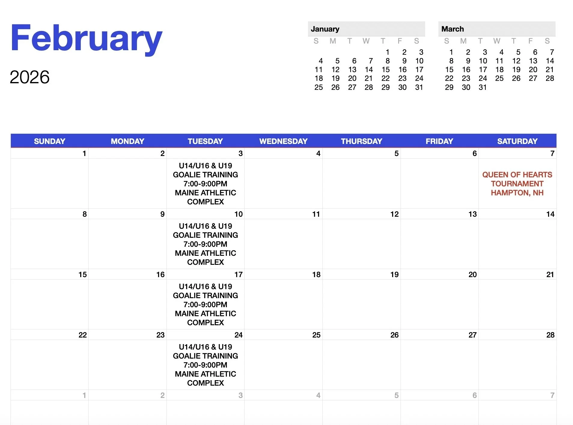 U14 GK optional team training : Sundays 4:15-5:45pm - XL Sports (400 North St, Saco)
