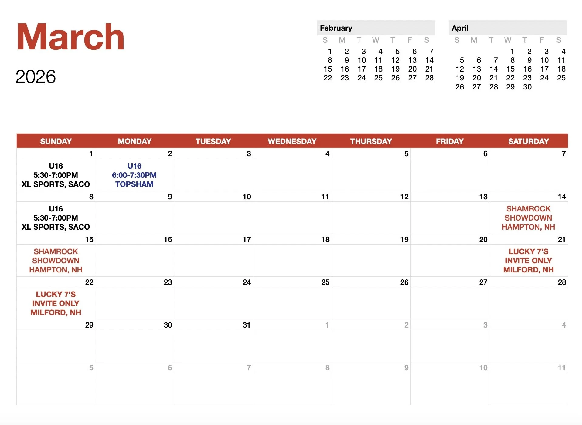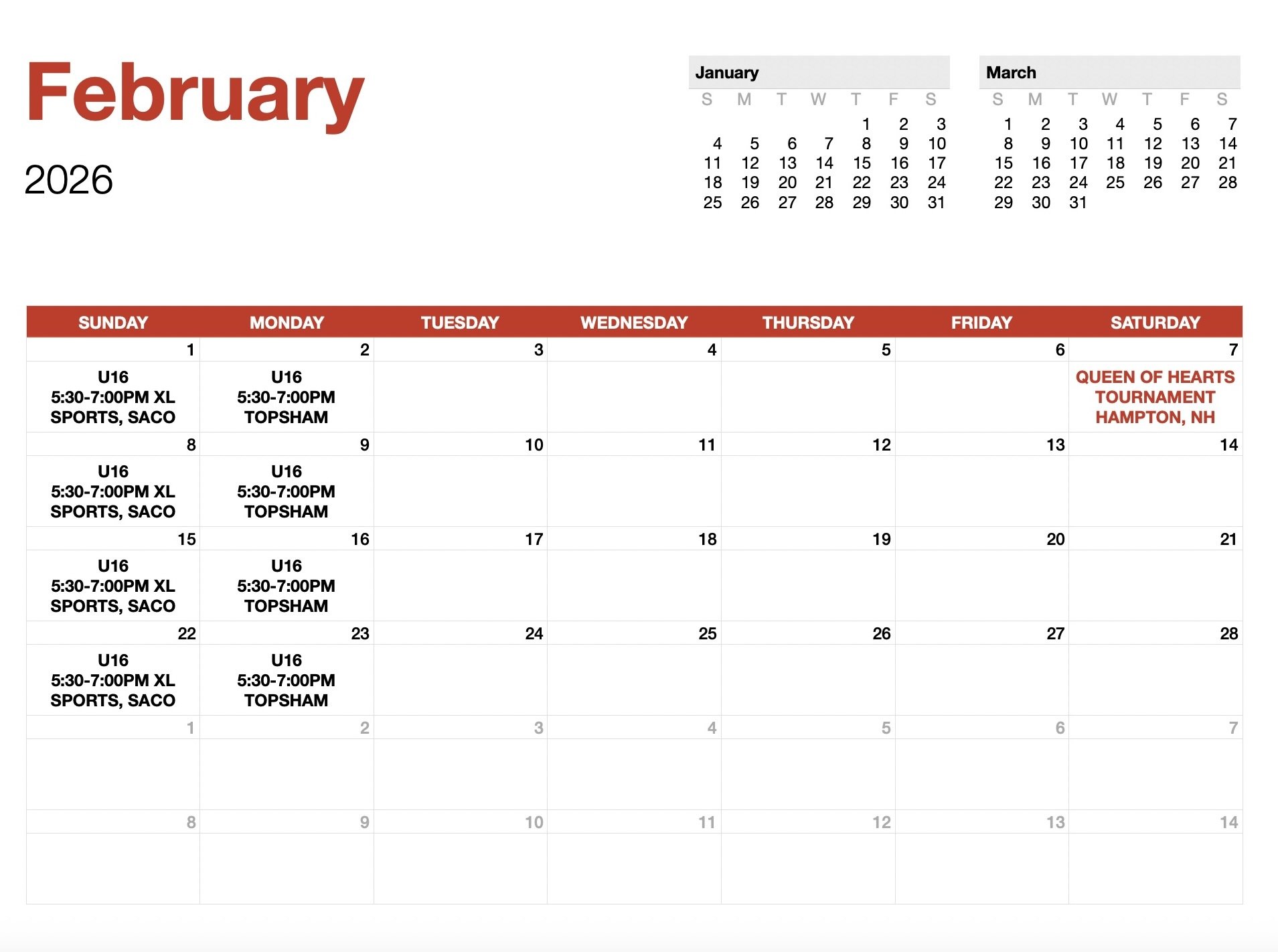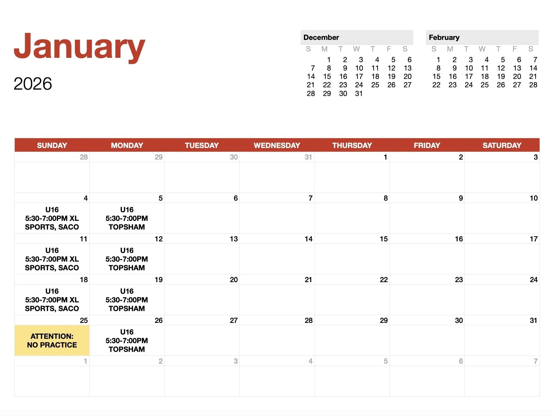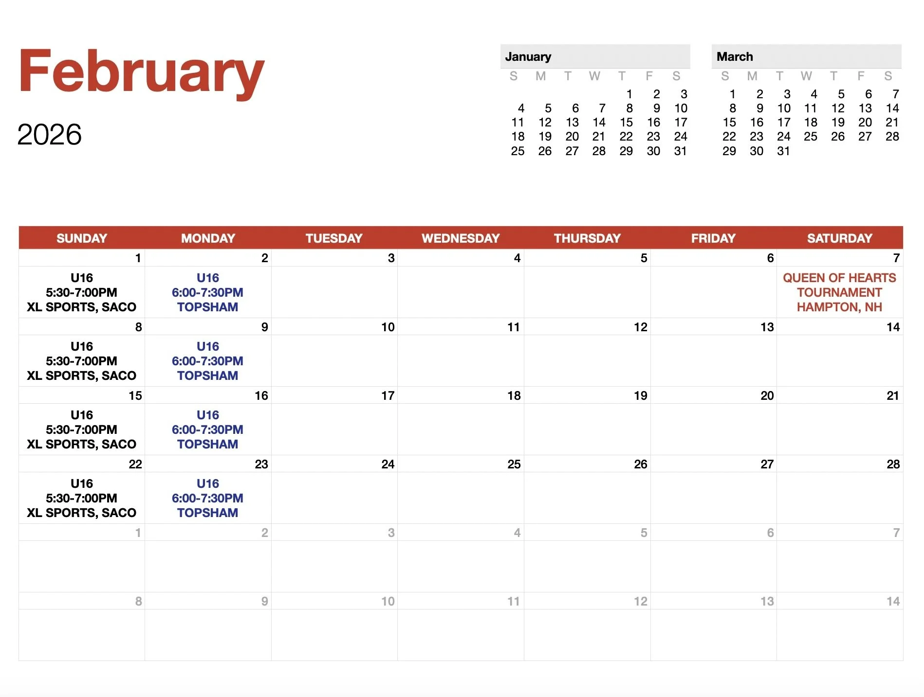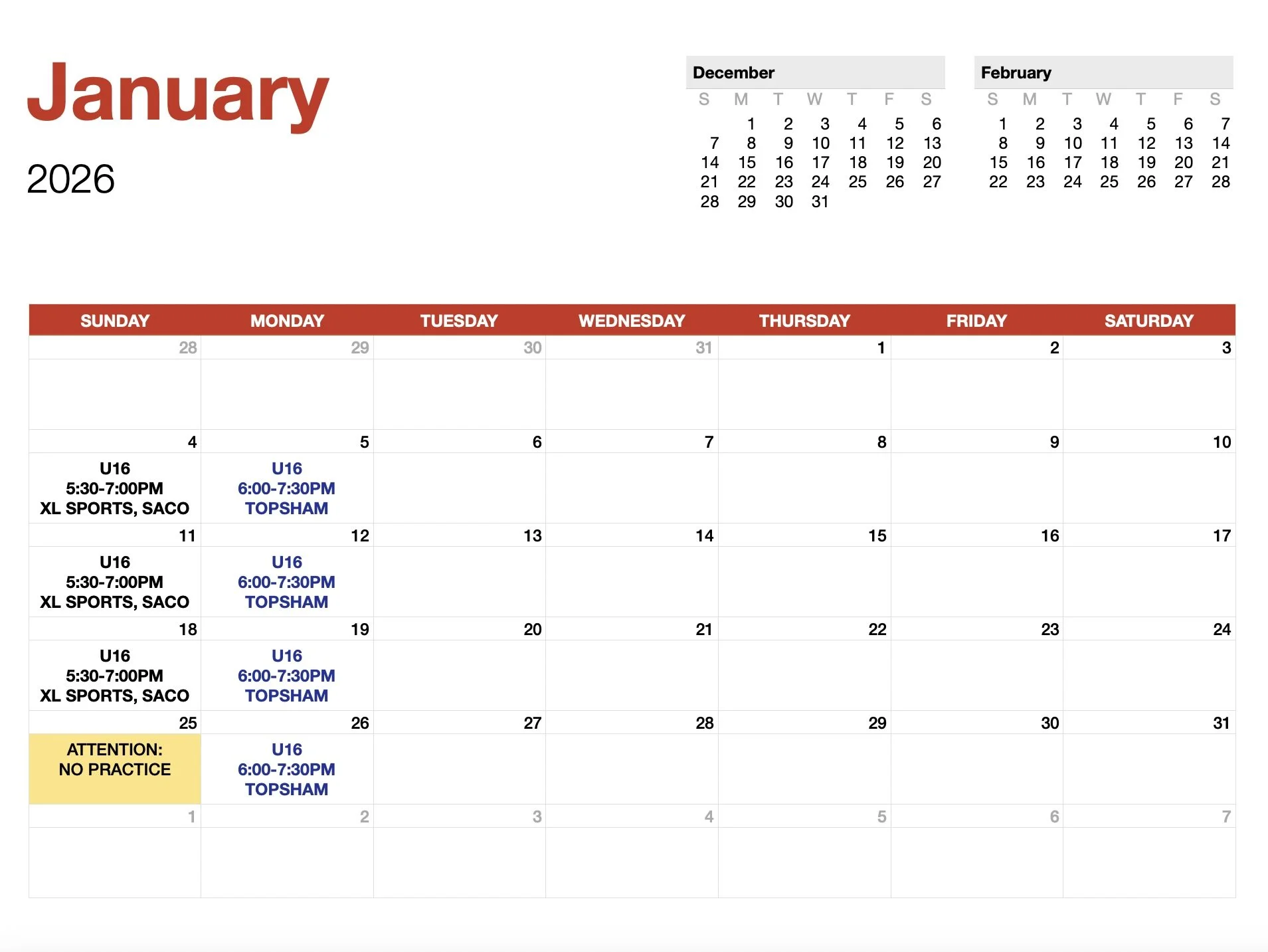 The Coastal 2026 U16 will train at the day(s) & time below: