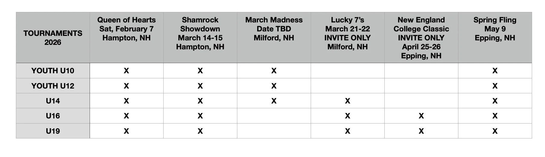Session II will begin March 16th until the Regional Club Championship (Date TBD - Usually the first week of June). Tryouts for Spring tournaments and RCC’s will be held the first week of Session II during practice. This tryout will determine our A & B teams for each age division for our Spring tournaments. More information to follow!