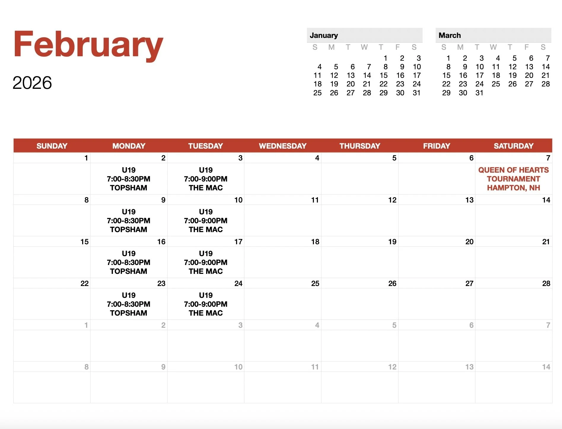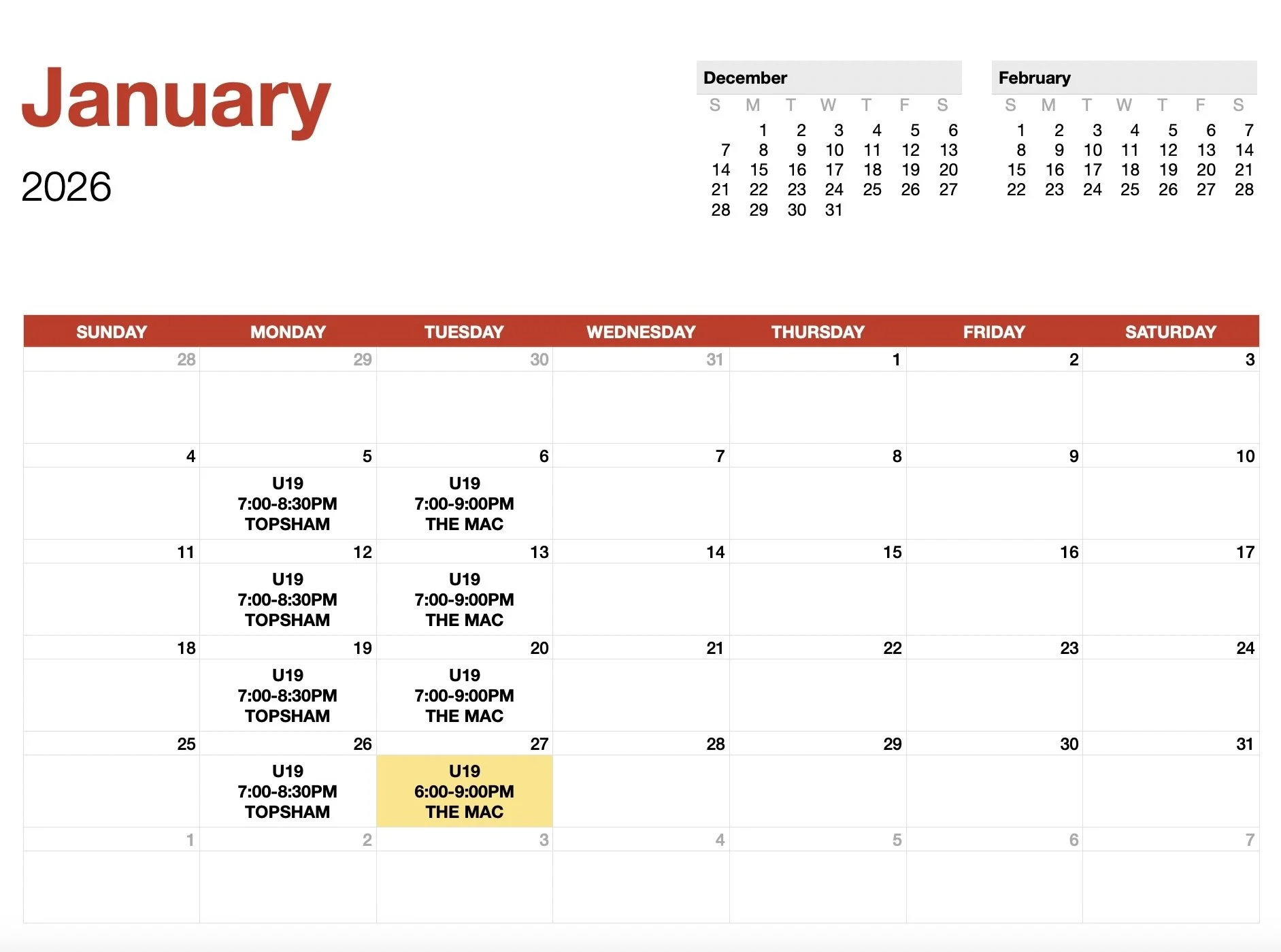 The Coastal 2026 U19 will train at the day(s) & time below: